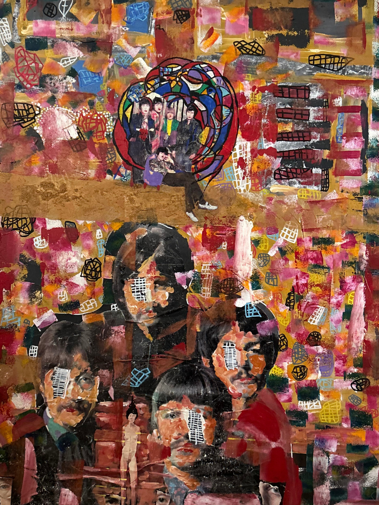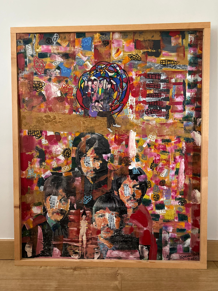 Laurent explore largement les collages et les techniques mixtes dans ses créations. Il assemble avec soin des éléments variés tels que des photographies, des extraits de journaux ou encore des fragments d’images, qu’il intègre à ses œuvres. Ces compositions prennent vie grâce à l’ajout de peinture et de traits au feutre, créant des pièces riches en textures et en contrastes. Chaque œuvre devient ainsi un dialogue entre les matériaux, les couleurs et les formes.