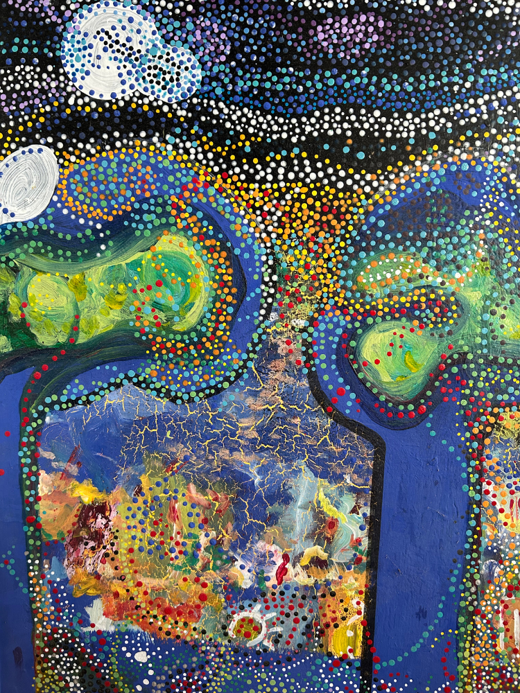 Les œuvres de Laurent qui se révèlent comme des explorations libres de formes, de couleurs et de textures. Abstraites et souvent organiques, ces pièces ne cherchent pas à imposer un message ou une lecture définitive. Au contraire, elles laissent place à une liberté d’interprétation totale. Fasciné par les motifs organiques, les points et les lignes entrelacées qui caractérisent cette tradition picturale, Laurent intègre ces éléments à son propre langage artistique.