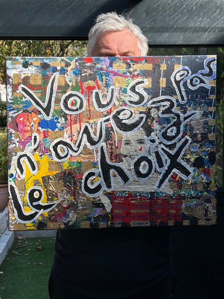 Laurent explore largement les collages et les techniques mixtes dans ses créations. Il assemble avec soin des éléments variés tels que des photographies, des extraits de journaux ou encore des fragments d’images, qu’il intègre à ses œuvres. Ces compositions prennent vie grâce à l’ajout de peinture et de traits au feutre, créant des pièces riches en textures et en contrastes. Chaque œuvre devient ainsi un dialogue entre les matériaux, les couleurs et les formes. Celle-ci, inspirée du street art, vous laisse libre interprétation…